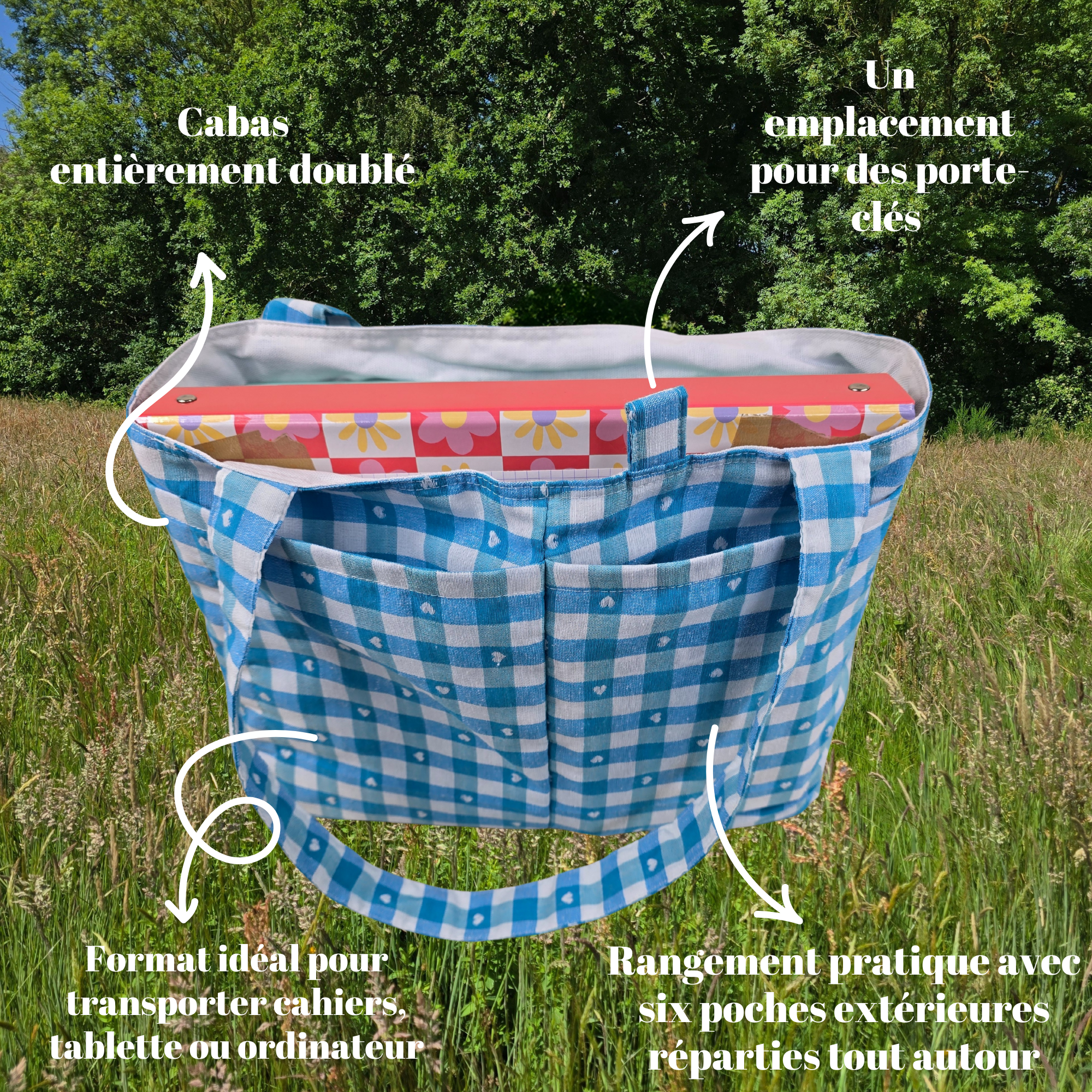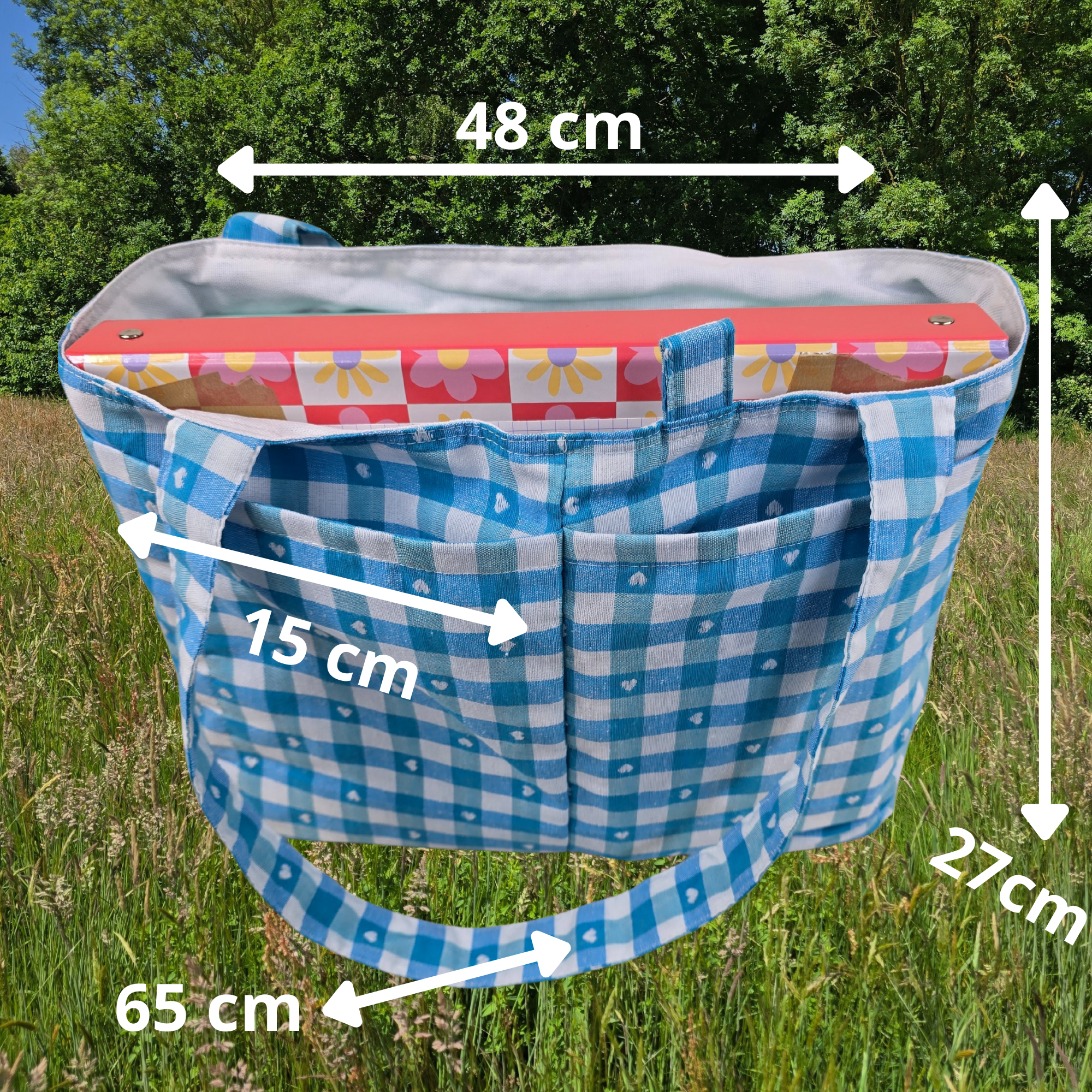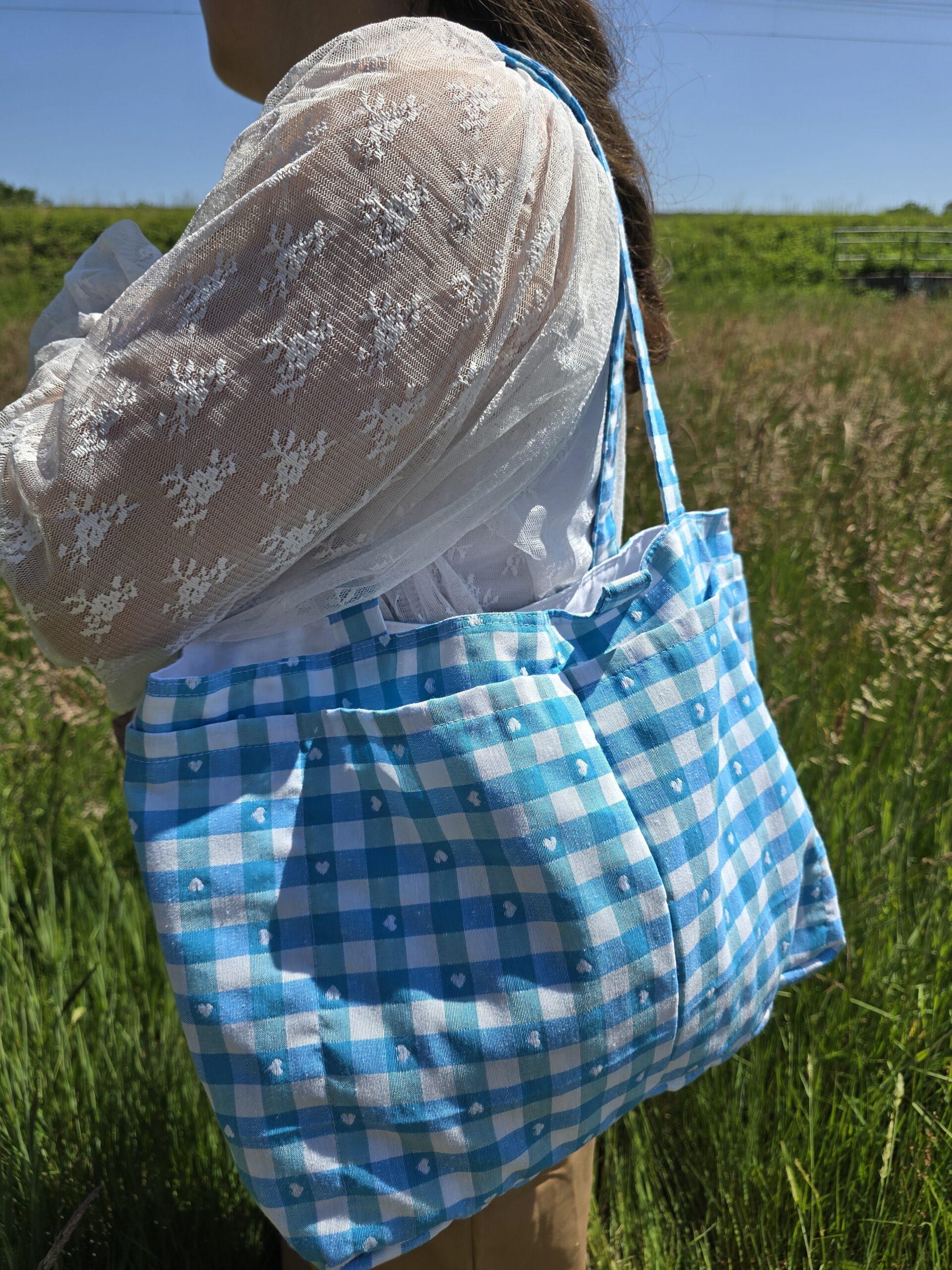 Le tissu extérieur est un coton vichy doux au toucher, décoré de petits cœurs blancs qui apportent une touche joyeuse et délicate. De plus, le sac se plie facilement pour se glisser dans une valise ou un autre sac, ce qui le rend parfait pour tes déplacements. L’intérieur est entièrement doublé d’un coton blanc uni, lisse et agréable au contact. Enfin, les anses larges offrent un confort optimal, que tu portes le cabas à la main ou à l’épaule.