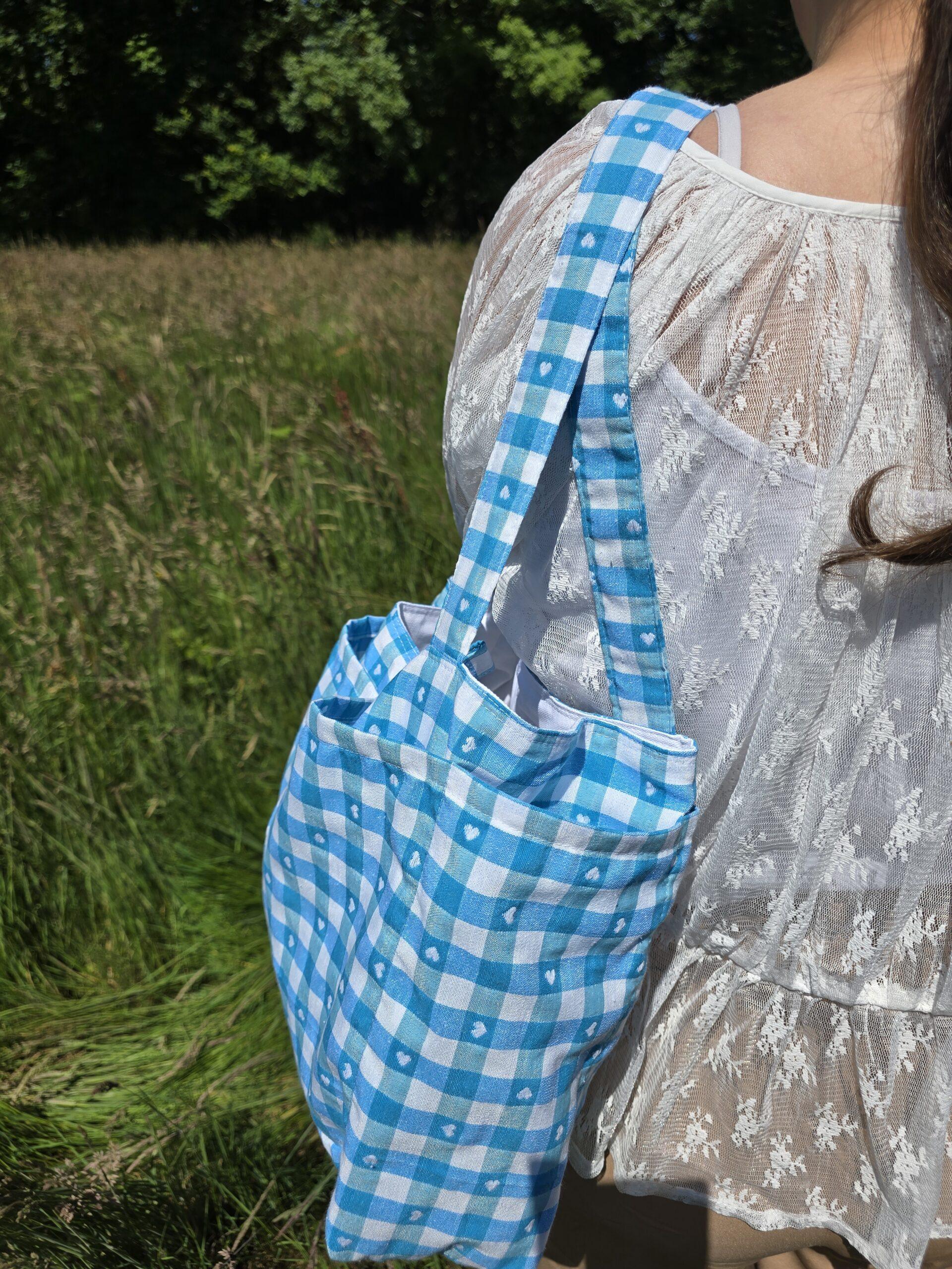 Matières : tissu neuf à carreaux bleu et blanc, imprimé de petits cœurs blancs ; doublure en coton d’ameublement blanc, doux et résistant