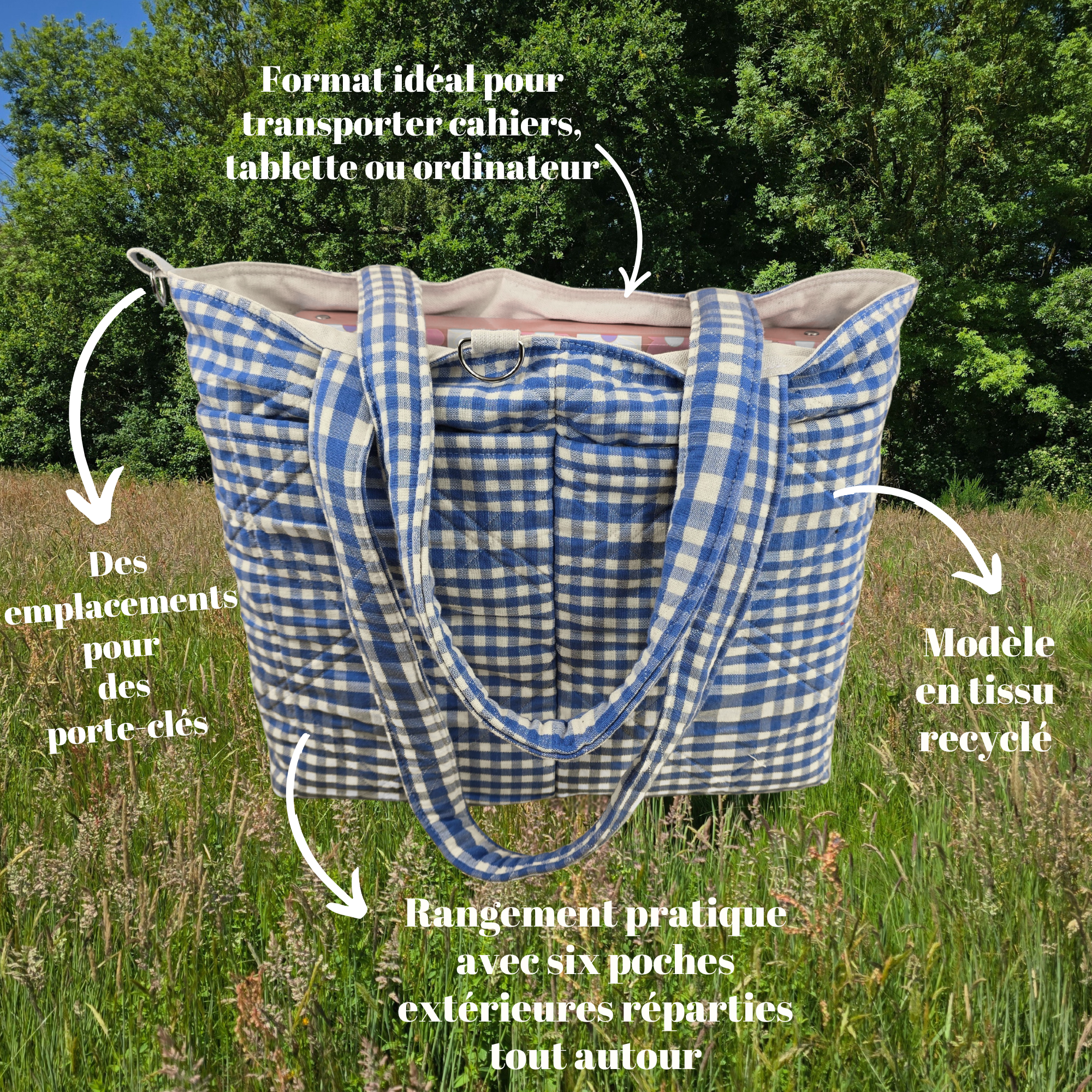 Détails du cabas matelassé en vichy bleu